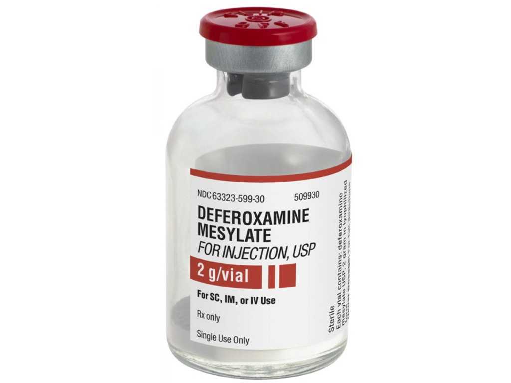 - Препарат Дефероксамин. Вводят внутривенно. Вещество, содержащееся в лекарстве, связывает ионы металла, образуя нетоксичные соединения. Затем эти комплексы выводятся из организма через мочу. Препарат не связывает металл в составе ферментов или аминокислот, а только выводит его излишки .