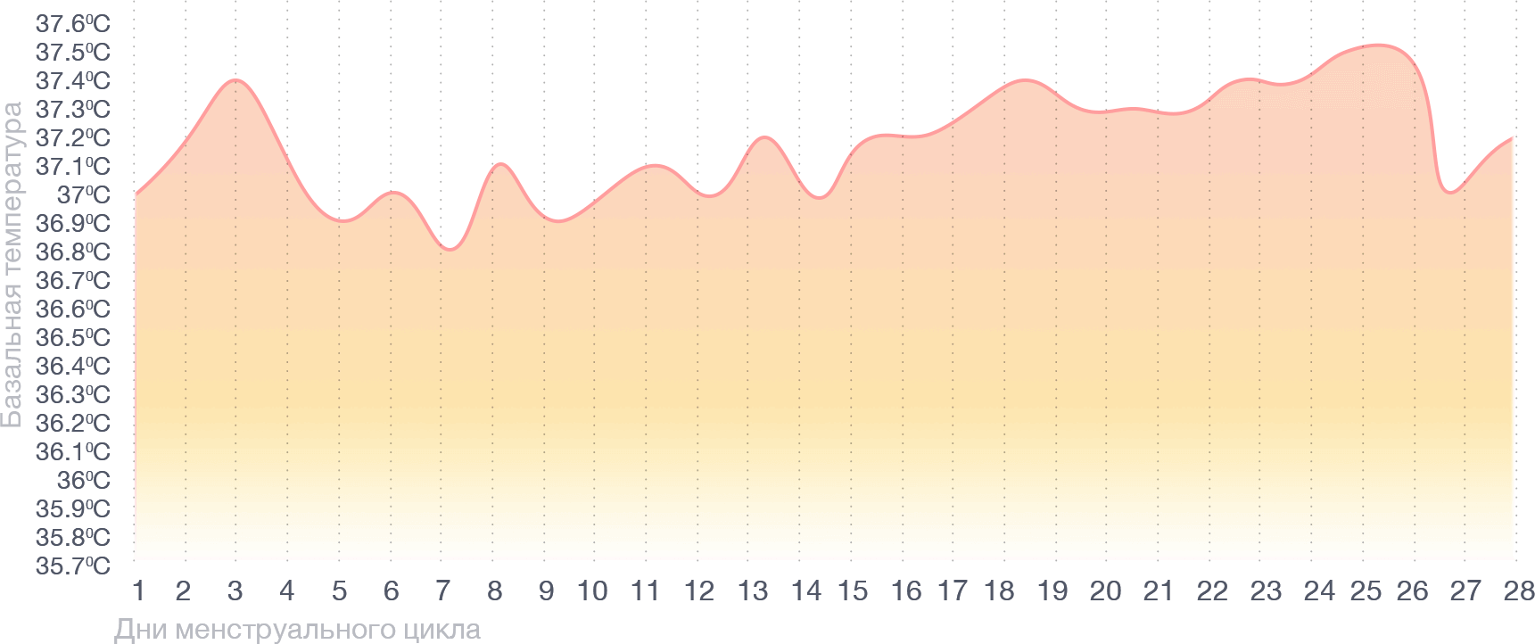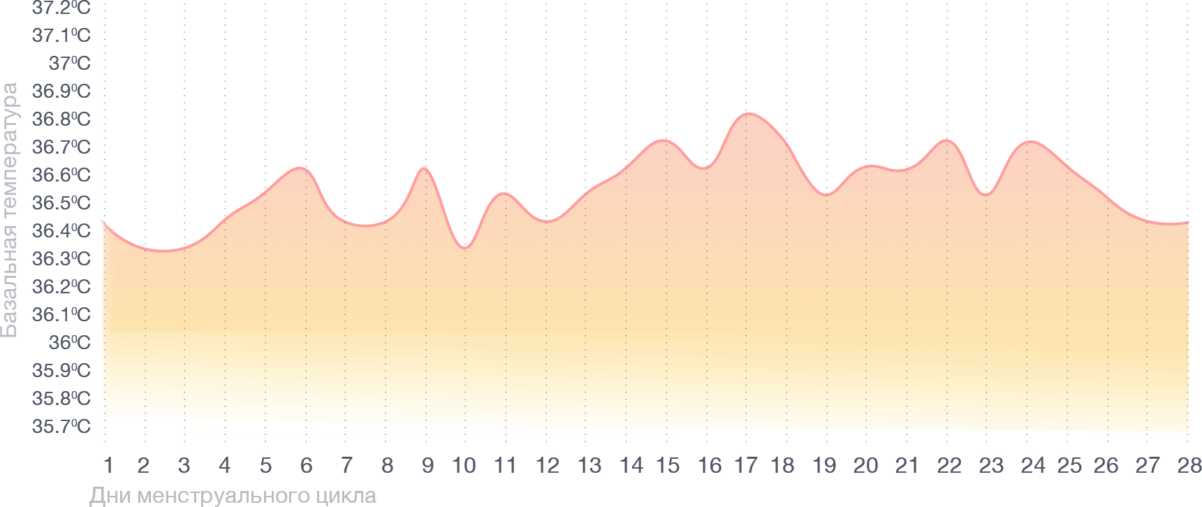 Описание того, как изменяется базальная температура во время менструального цикла, — полезная информация, но ее может быть сложно понять без конкретных примеров. Поэтому давайте рассмотрим несколько графиков, наглядно показывающих, какие измерения могут у вас получиться4.