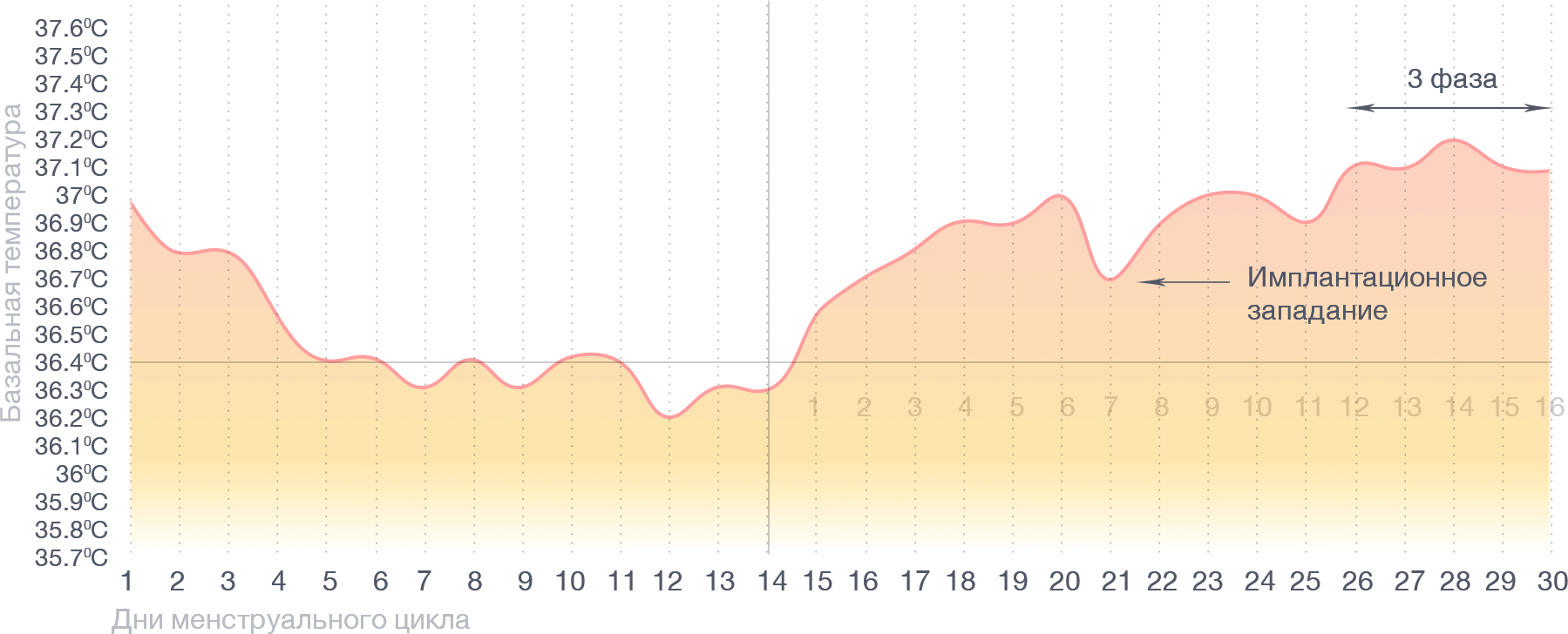 Базальная температура при ранней беременности падает в день, когда происходит имплантация яйцеклетки5. Характерное имплантационное западение делит вторую фазу на две, и в вашем графике появляется третья фаза, свидетельствующая о том, что беременность началась. Стоит помнить о возможных неточностях измерений и лучше подождать, когда этот радостный факт подтвердит ваш врач. Но, скорее всего, вас уже можно поздравить — вы начали свой путь к тому, чтобы стать лучшей мамой лучшему малышу на свете!