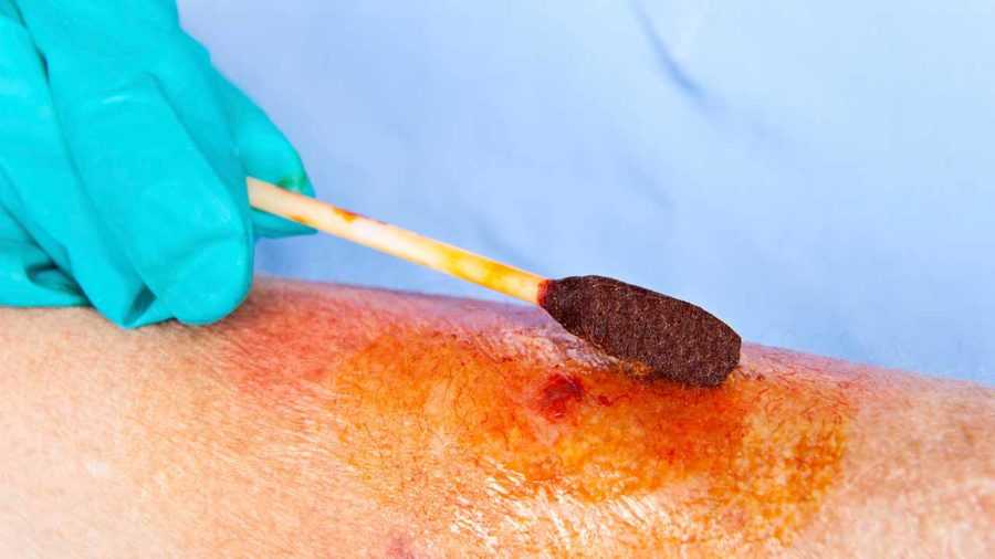Нужно каждые 3 часа обрабатывать повреждение кожи антисептическими средствами: раствором марганцовки, йодом, зеленкой,