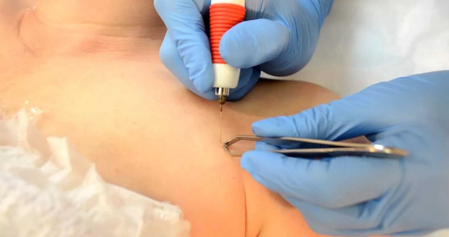 - Таким методом, в отличие от радиоволнового, можно удалить образование любой величины. Даже если оно глубоко проникло в кожный покров.