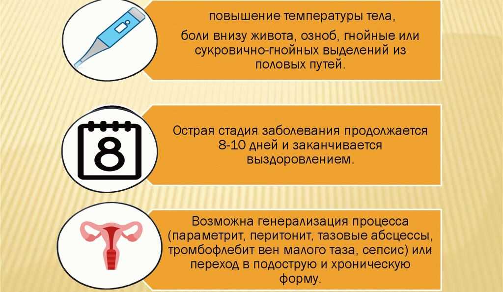 Различают острую и хроническую формы эндометрита. Первая развивается спустя 3–4 суток после проникновения инфекции. Для нее показательны: