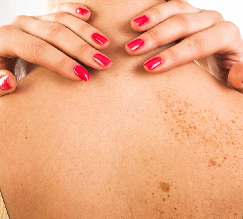 - на открытых частях тела, наиболее подверженных воздействию солнца;