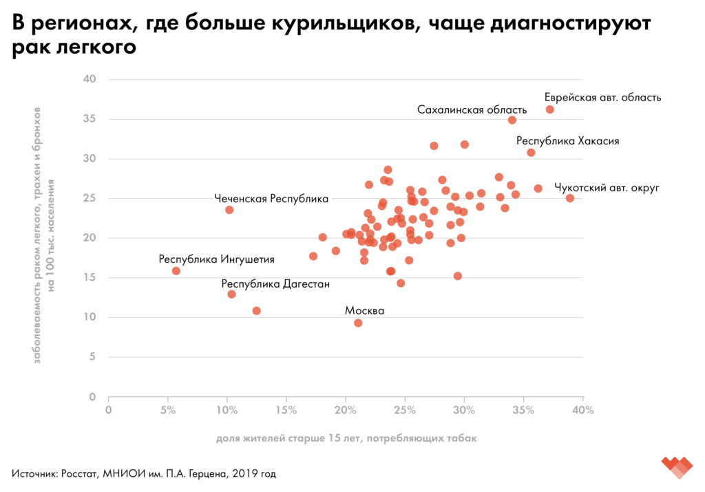 Заболеваемость раком легкого, трахеи и бронхов выше в тех регионах России, где выше доля курильщиков Например, регионы на Дальнем Востоке — лидеры по числу курящего населения и также в топе по числу пациентов с онкологическими болезнями органов дыхания.