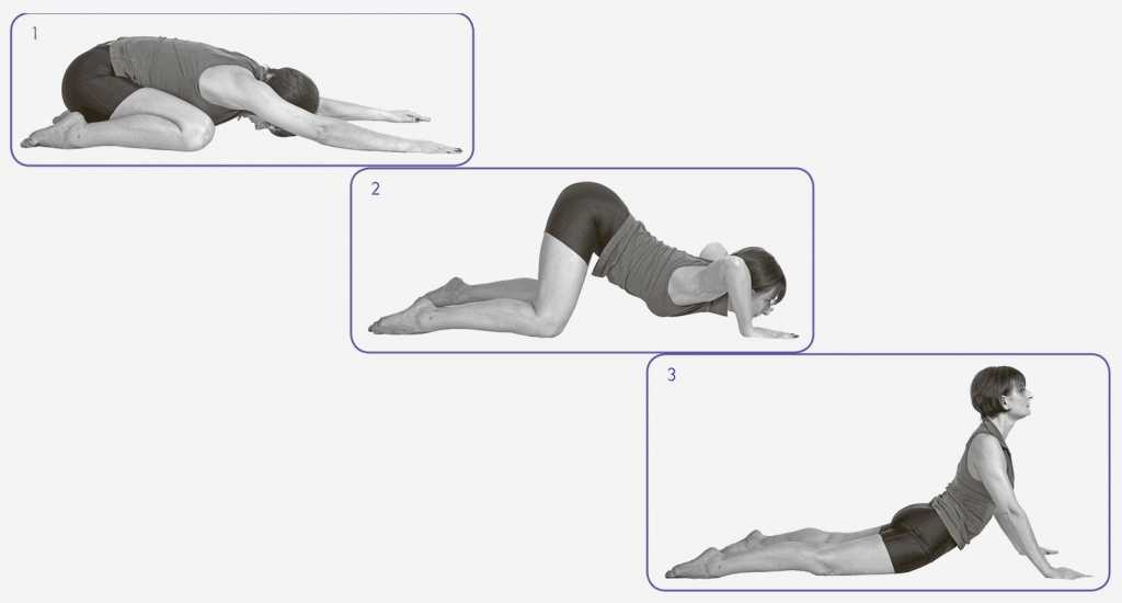 Лечь на живот. Руки отвести назад и сделать пальцевый замок. Положить голову на бок, прижать тело к полу, расслабиться. На вдохе поднять лицо, плечи и весь верх спины, стараясь достать пальцевым замком до нижней линии ягодиц. Выдохнув, вернуть голову на пол, но повернув в другую сторону.