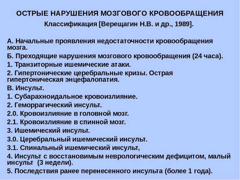 Инсульты классифицируют в соответствии с их предполагаемыми патофизиологическими механизмами. В каждом случае инсульта можно определить как клинические проявления, так и принципы диагностики и лечения. При диагностике инсульта или транзиторной ишемической атаки (ТИА) прежде всего оценивают исходные клинические проявления и их динамику, т. е. решают вопрос «инсульт или синдром транзиторная ишемическая атака (ТИА, микроинсульт)?».