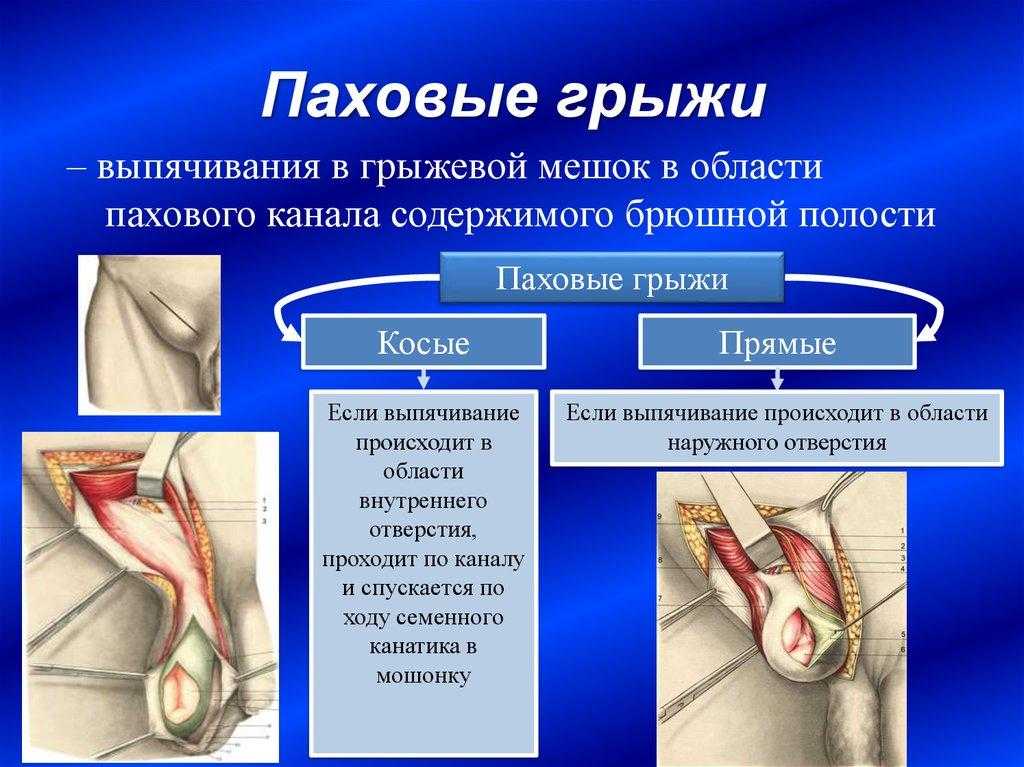 Прямые паховые грыжи появляются после рождения, чаще у взрослых пациентов. При этой разновидности грыжевой мешок «вываливается» непосредственно в паховое пространство. Косая паховая грыжа проходит сквозь внутреннее паховое кольцо и семенной канатик. Такой вид грыжевого дефекта может появиться и у детей, в том числе у новорожденных. Косая паховая грыжа может быть: