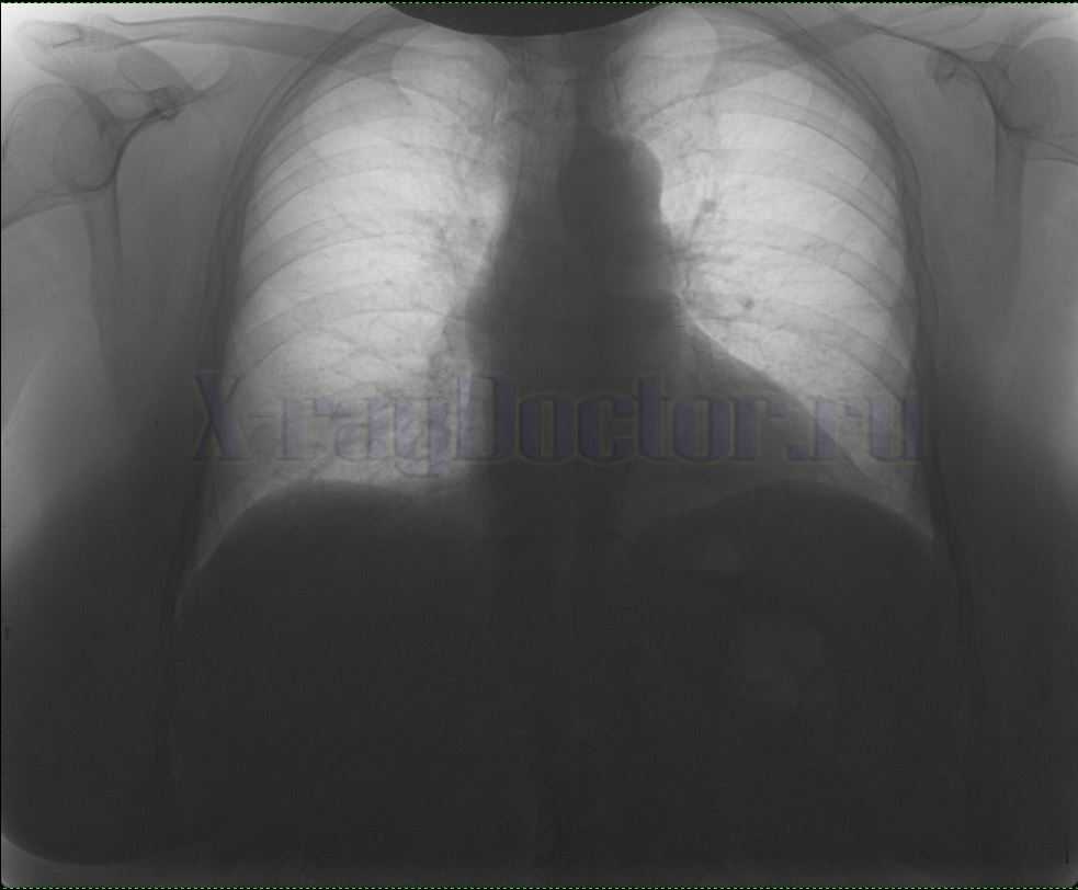 На рисунке приведена нормальная рентгенограмма легких. Запомните ее вид. Если на снимке обнаружите дополнительные пятна, которые отличаются от вышеприведенного фото, скорее всего, такая картина будет отражать патологический процесс.