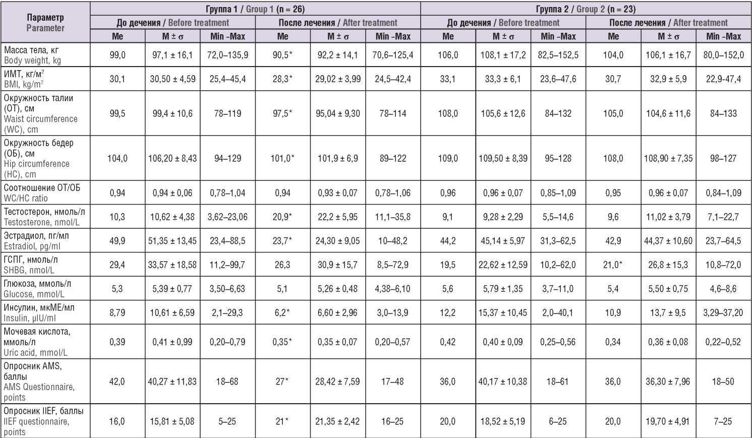 Примечание: ИМТ – индекс массы тела; ГСПГ – глобулин, связывающий половые гормоны; AMS – опросник симптомов старения мужчин; IIEF – опросник для выявления симптомов дефицита тестостерона; *р < 0,05 – различия статистически значимы по сравнению с началом лечения.Note: BMI – body mass index; SHBG – sex hormone binding globulin; AMS – Aging Males Symptoms questionnaire; IIEF – International Index of Erectile Function questionnaire; * p < 0.05 –significant differences compared to the onset of treatment.