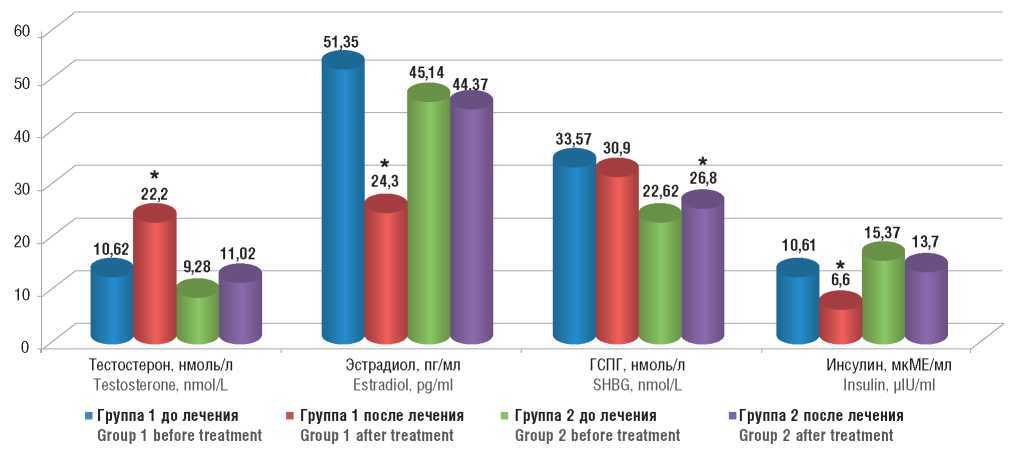 Рисунок 1. Значения тестостерона, эстрадиола, глобулина, связывающего половые гормоны (ГСПГ), и инсулина в крови обследованных пациентов до и после лечения.Примечание: *р < 0,05 – различия статистически значимы по сравнению с началом лечения.