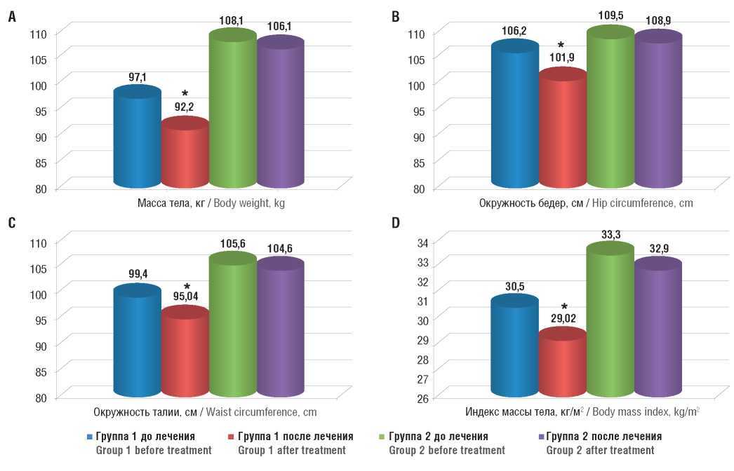Рисунок 2. Масса тела (А), окружность талии (В), окружность бедер (С) и индекс массы тела (D) обследованных пациентов до и после лечения.Примечание: *р < 0,05 – различия статистически значимы по сравнению с началом лечения.