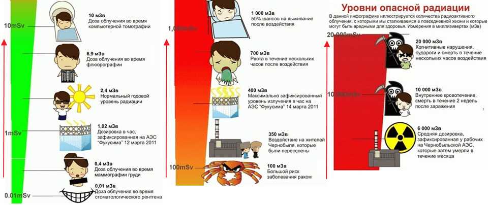 - свыше 100 Зв — оказывает колоссальный вред, влечет смерть спустя несколько часов (максимум 48 часов) после облучения из-за прекращения функционирования ЦНС.