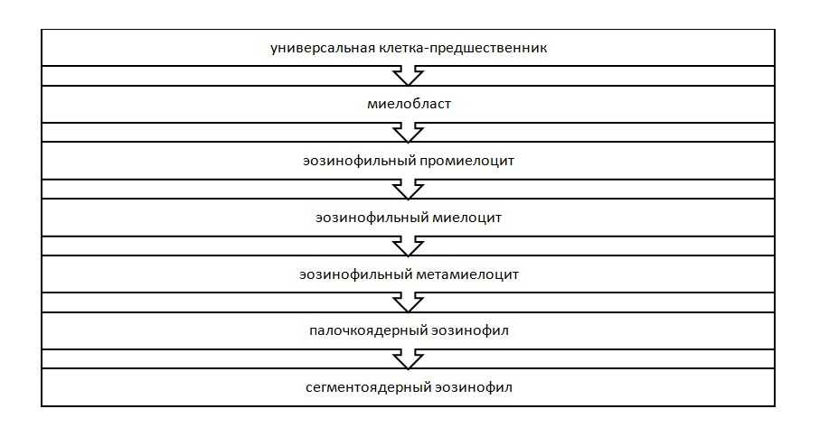 Все клетки крови созревают в костном мозге. Там же из универсальной клетки-предшественницы происходит созревание эозинофилов (рисунок 1).