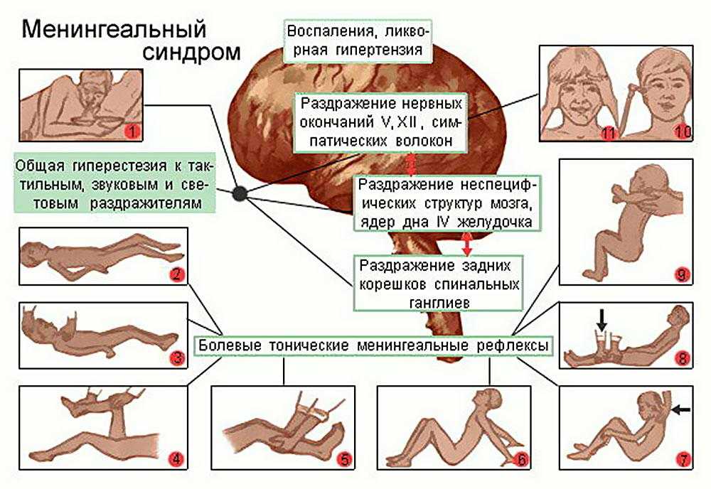 Наличие только одного из симптомов менингиальной триады не говорит о том, что у ребенка менингит.Помимо менингиальной триады симптомов существуют еще и оболочечные симптомы, связанные с раздражением нервных окончаний, расположенных в мозговых оболочках. К таким симптомам относятся: