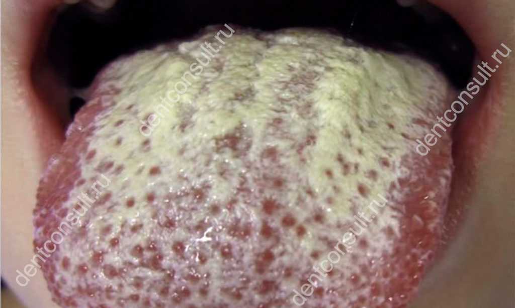 - формирование обильного налета на зубах, деснах и поверхности языка.
