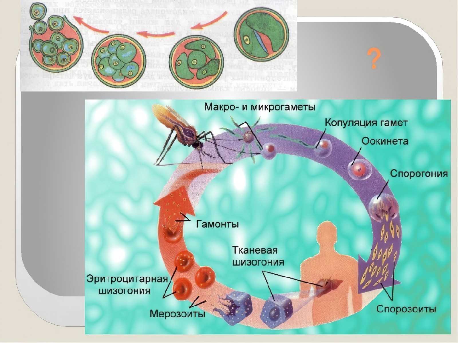 Интересной особенностью паразитов типа Apicomplexa является способность чередования в жизненном цикле полового (гамогония) и бесполого (агамогония) способов размножения. При этом происходит смена «хозяина». В человеческом организме, являющимся для малярийного плазмодия «промежуточным хозяином», возможно только бесполое размножение. А фаза полового размножения – прерогатива основного «хозяина» и переносчика малярии, то есть комара.