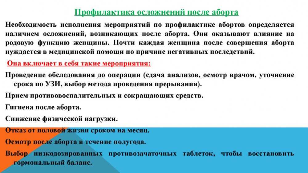 Развитие этих состояний вероятно в первые дни после прерывания. Насторожить могут изменение характера и количества выделений, усиление болей, повышение температуры. При возникновении этих признаков необходимо немедленно обратиться к врачу.