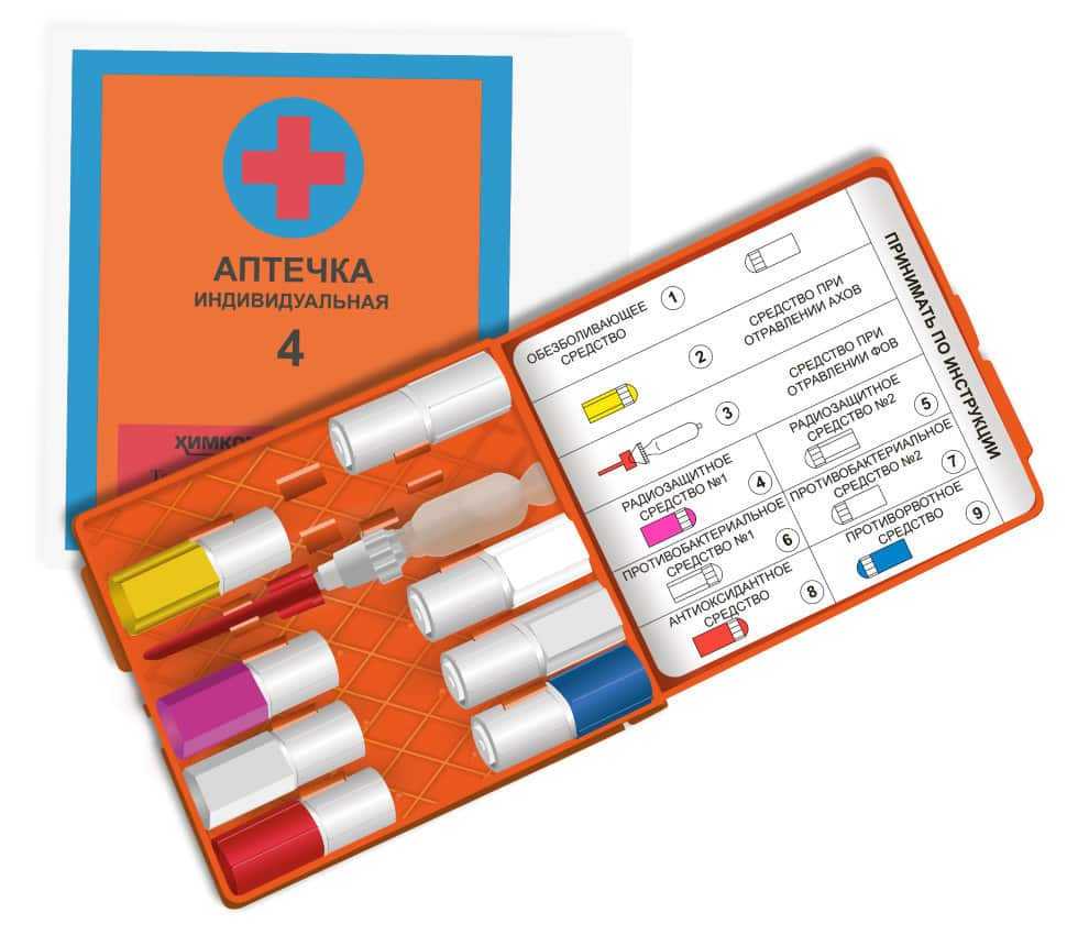 - Средство при отравлении ФОВ (гнездо № 3, шприц-тюбик с красным колпачком. Для внутримышечного использования. Принимается по сигналу Гражданской обороны); Пеликсим АЛ-85.