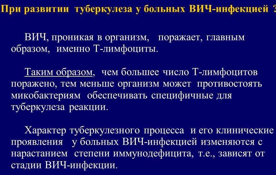Туберкулез на фоне ВИЧ-инфекции сокращает продолжительность жизни человека, поэтому очень важно во время диагностировать и начать лечить данное оппортунистическое заболевание
