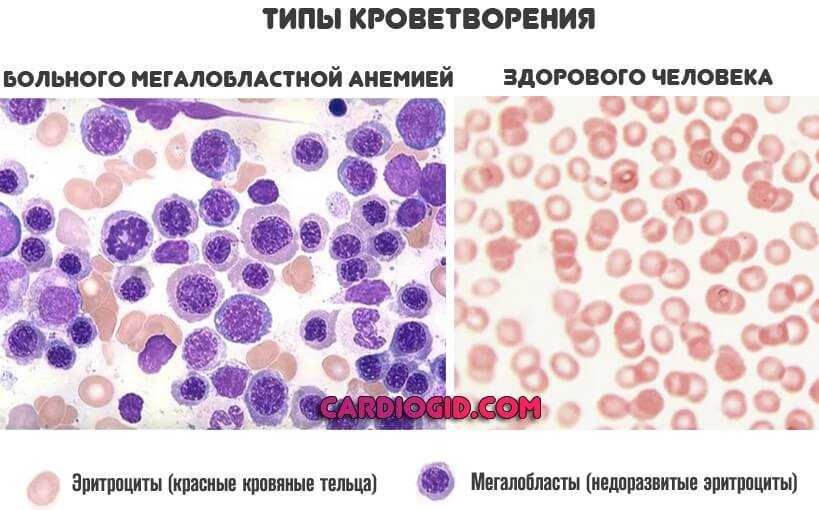 Дефицит метилкобаламина лежит в основе нарушения образования ряда нуклеиновых кислот, в результате чего в красном костном мозге запускается мегалобластный тип эритропоэза. При этом эритроциты становятся очень большого размера, то есть превращаются в мегалоциты. Они уже не могут выполнять свою функцию по транспорту кислорода, а кроме того срок жизни их значительно сокращается. Все это приводит к тому что количество гемоглобина, эритроцитов в крови снижается и у человека развивается малокровие.