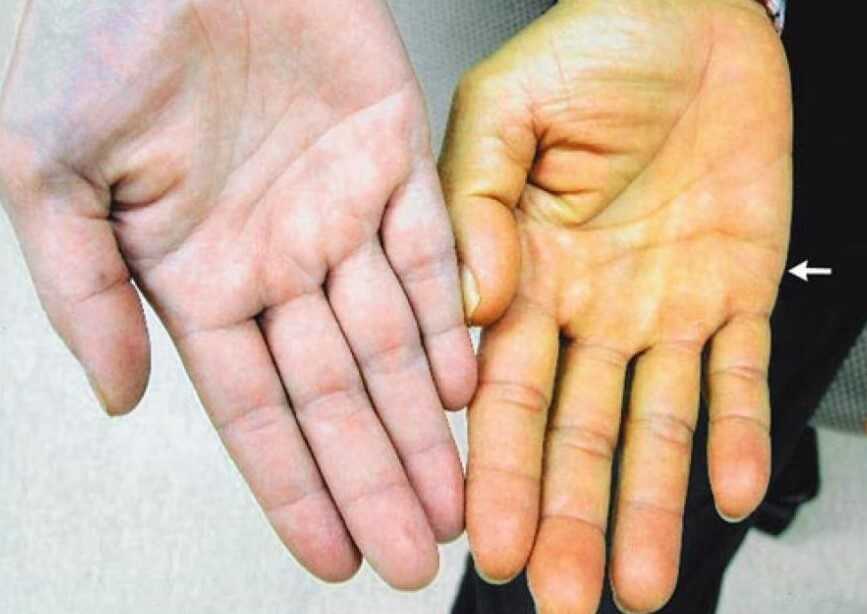 - Пожелтение кожи. В ходе изменения процесса кроветворения при пернициозной анемии (развивается при недостатке витамина B12) наблюдается усиленная выработка билирубина. Механизм такого отклонения сложен, отмечается цепь биохимических явлений.