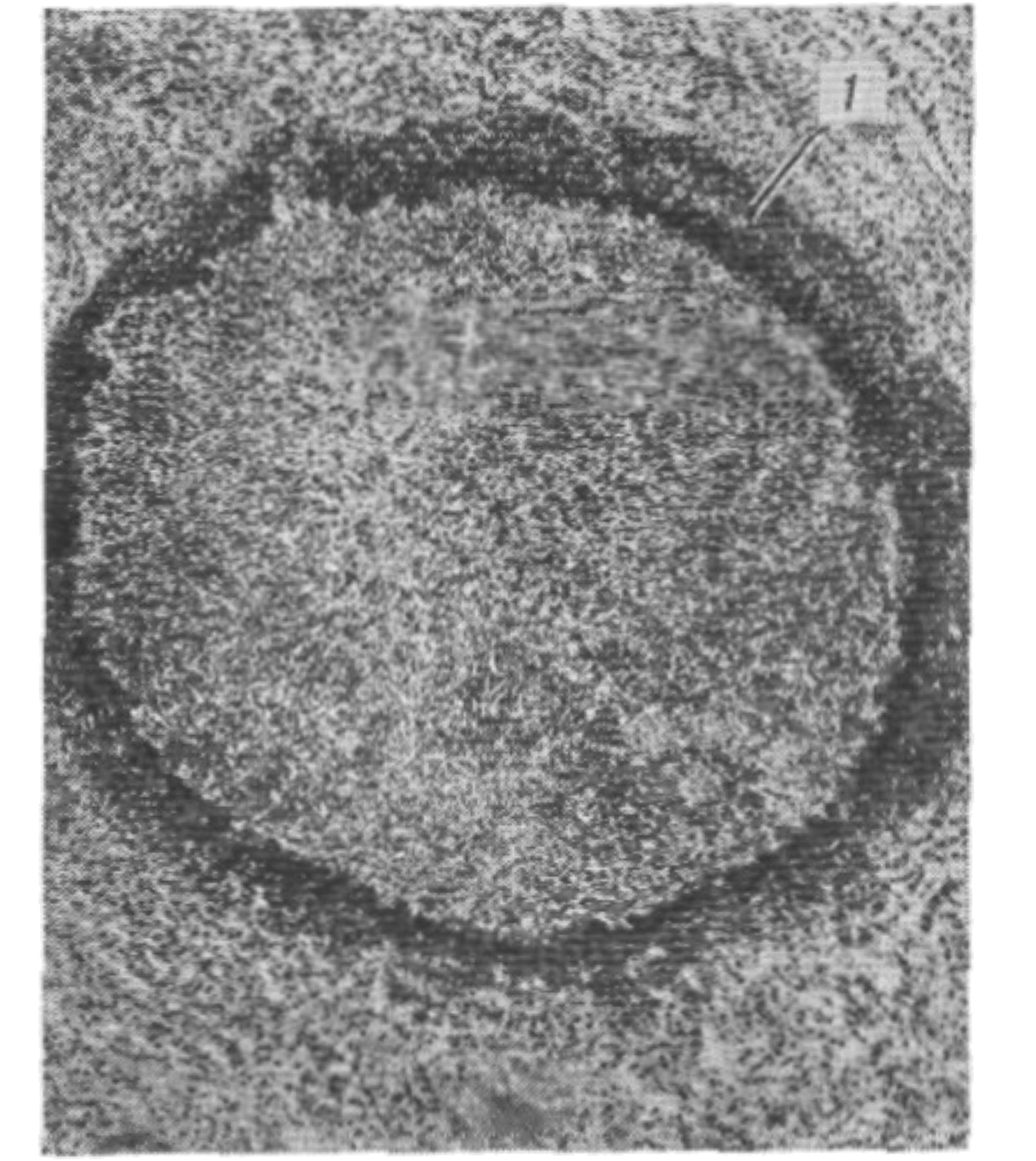Рис. 1. Острый абсцесс. Участок ткани, инфильтрированный гнойным экссудатом. Скопление лейкоцитов по периферии абсцесса (1).