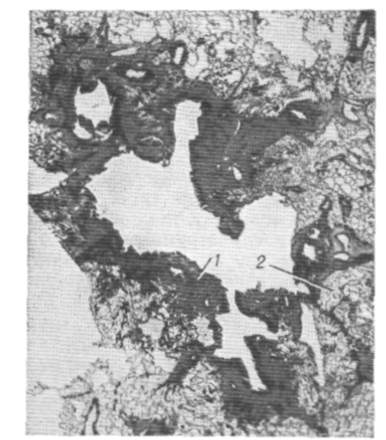 Рис. 2. Хронический абсцесс легкого. Стенка полости образована пиогенной мембраной, состоящей на двух слоев: 1 — внутренний слой (грануляции и обрывки некротизированной ткани); 2 — наружный слой (зрелая соединительная ткань).