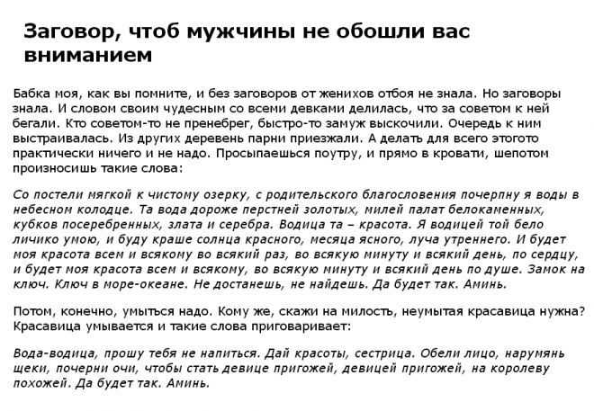 Заговоры, приведённые ниже, помогают привлечь мужской пол. Они просты в исполнении, но сложны в работе: такой заговор обновляет, очищает и реструктуризирует энергетику женщины, наполняет её силой и уверенностью в себе. Мужчины это чувствуют и их начинает ощутимо влечь к ворожее. По сути, эти заговоры направлены внутрь, а не наружу, как ошибочно полагают многие. Такими заговорами женщина воздействует на саму себя, в то время как мир вокруг подстраивается под эти изменения. Неоспоримый плюс этих заговоров заключается в их безвредности и исключительно положительном воздействии на жизнь.