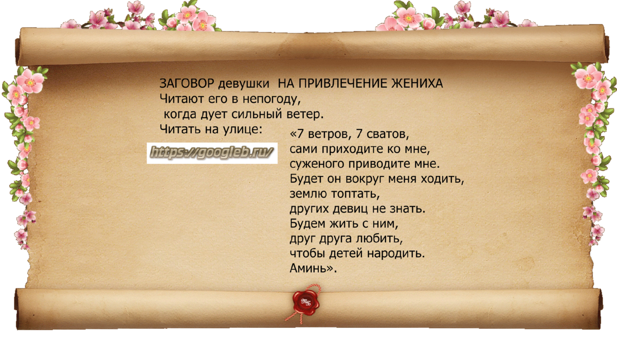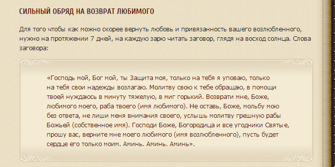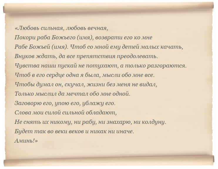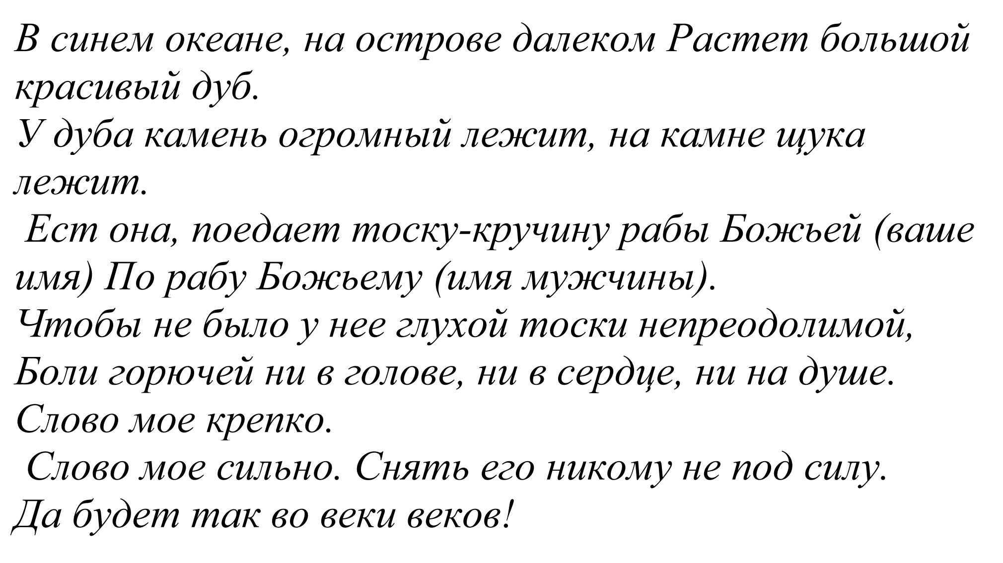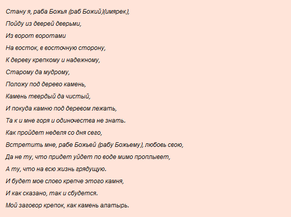 «Мой ценный клад — любовный заклад. Спрячу тебя в сырую темницу, поможешь мне стать красавицей. Днями долгими да ночами темными тяни женихов к рабе Божьей (свое имя). Буду я красива, буду я молода, буду желанна, да счастлива. Пусть печалятся женихи по мне, пусть тоскуют да горько горюют. Ни при солнце, ни при луне не позабыть им обо мне. На земле, да на воде, помнить обо мне везде. Буду я им светла, как солнца свет, ясна, как лунный лик, тепла, как мягкая волна. Будут меня одну вомнить среди всех девиц. С восторгом будут все меня встречать, да взглядами долгими провожать. Слово мое верно, слово мое крепко, как сказала я, так и будет. Аминь».
