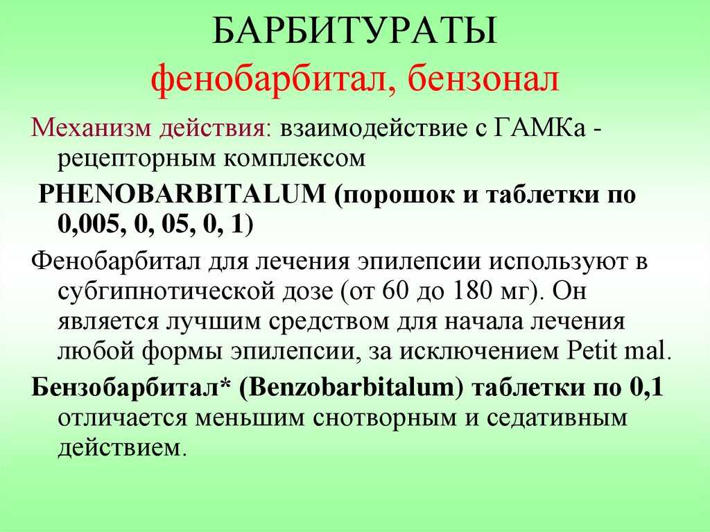 Действие бензобарбитала направлено на особые рецепторы центральной нервной системы, антагонистом которых является гамма-аминомасляная кислота (ГАМК). Это вещество снижает проницаемость мембран натриевых нервных волокон, что способствует уменьшению распространения импульсов из очагов эпилептической активности.