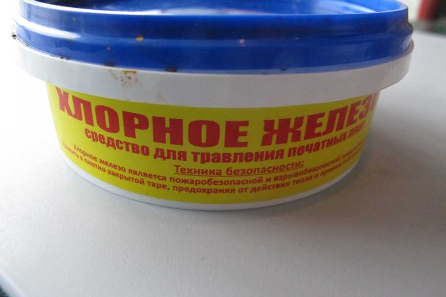 Первым делом открываем нашу емкость с хлорным железом. Стараемся не выпачкать им руки, одежду и стол, т.к. его практически невозможно отмыть или отстирать от ткани.