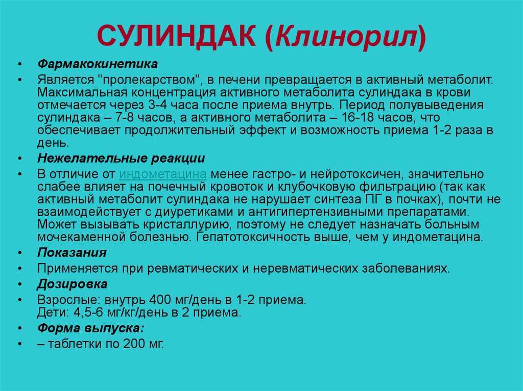 Клинорил – нестероидное противовоспалительное средство на основе сулиндака (по 200 мг в 1 таблетке). Оказывает жаропонижающее, болеутоляющее воздействие. Быстро устраняет воспаление, облегчает общее состояние пациента при болях разной этиологии.