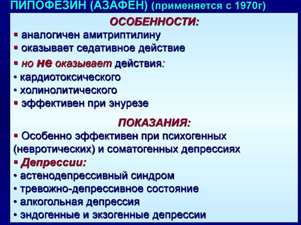 В связи с почти полным отсутствием холинолитического действия азафен можно назначать больным глаукомой и при других заболеваниях, при которых противопоказано применение препаратов, обладающих холинолитической активностью, в том числе имипрамина и амитриптилина.