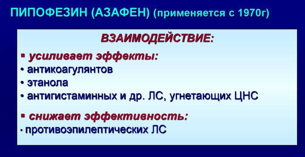 Усиливает эффекты антикоагулянтов, этанола, антигистаминных и др. ЛС, угнетающих ЦНС. Снижает эффективность противоэпилептических ЛС. Азафен, как и другие трициклические антидепрессанты, не следует назначать совместно с ингибиторами МАО. После применения этих препаратов азафен можно назначать через 1 — 2 нед.