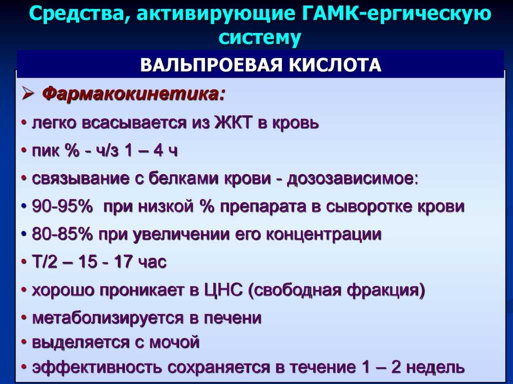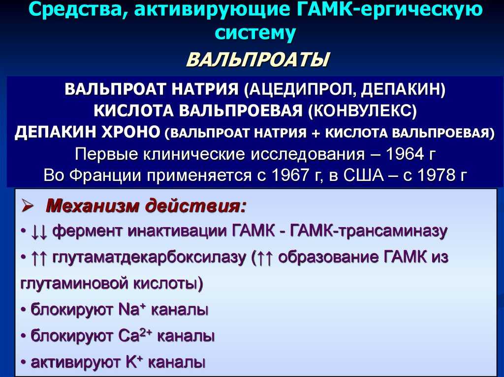 - вальпроевая кислота влияет на ГАМК-ергическую систему. Она повышает концентрацию ГАМК в ЦНС и стимулирует ГАМК-ергическую передачу;